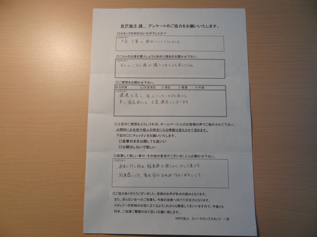樹木葬墓地「こもれびの里」に納骨されたO様よりアンケートのご返送を頂きました。