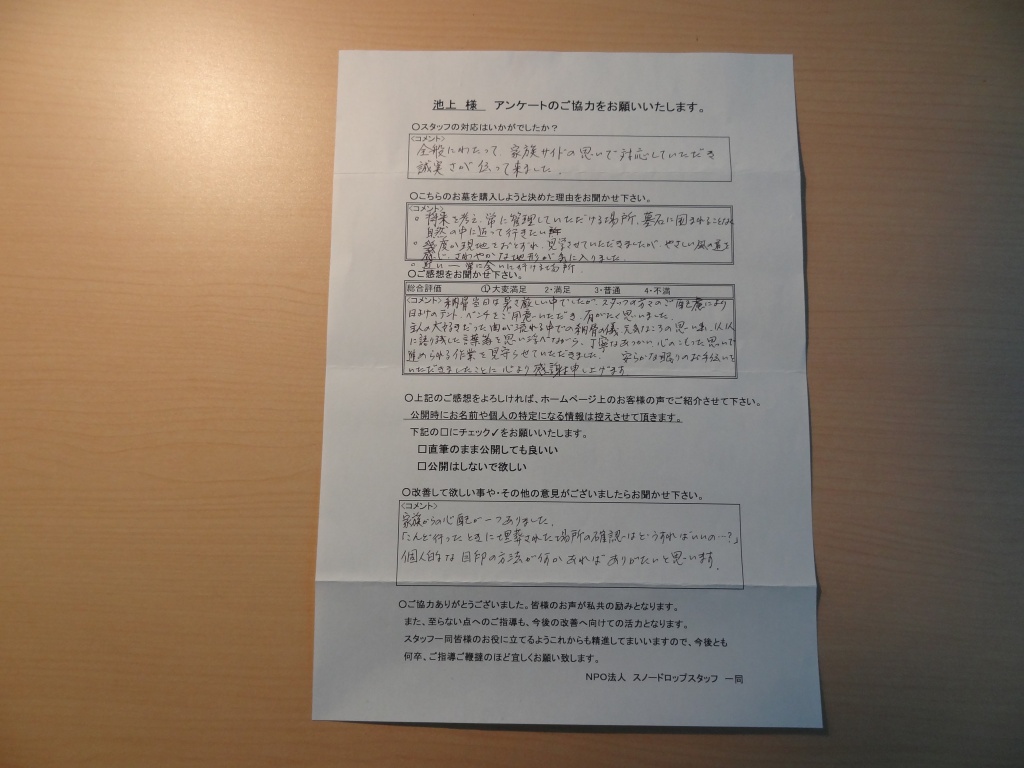 樹木葬墓地「こもれびの里」に納骨されたI様よりアンケートのご返送を頂きました。