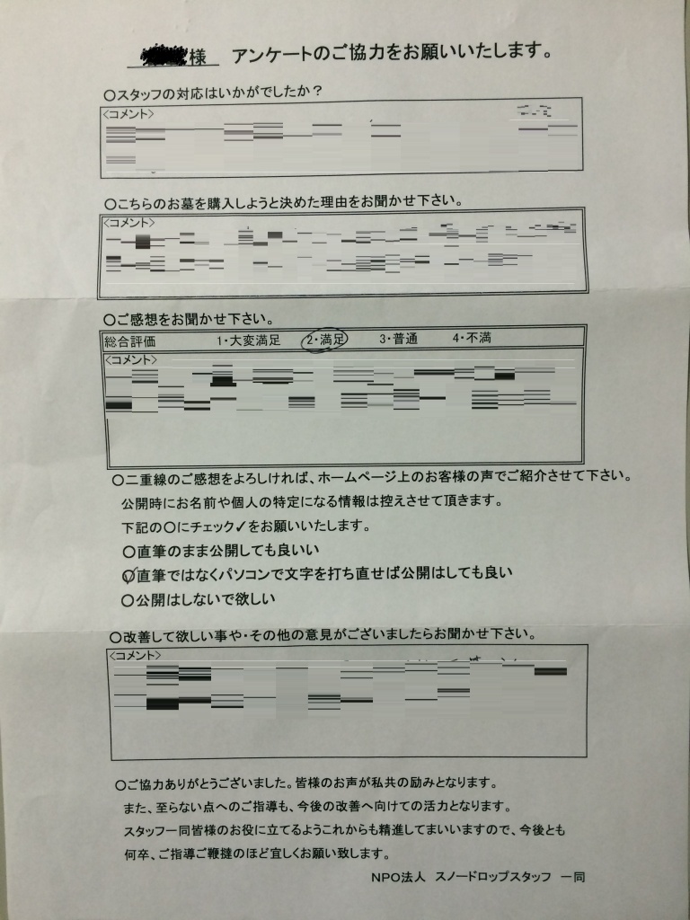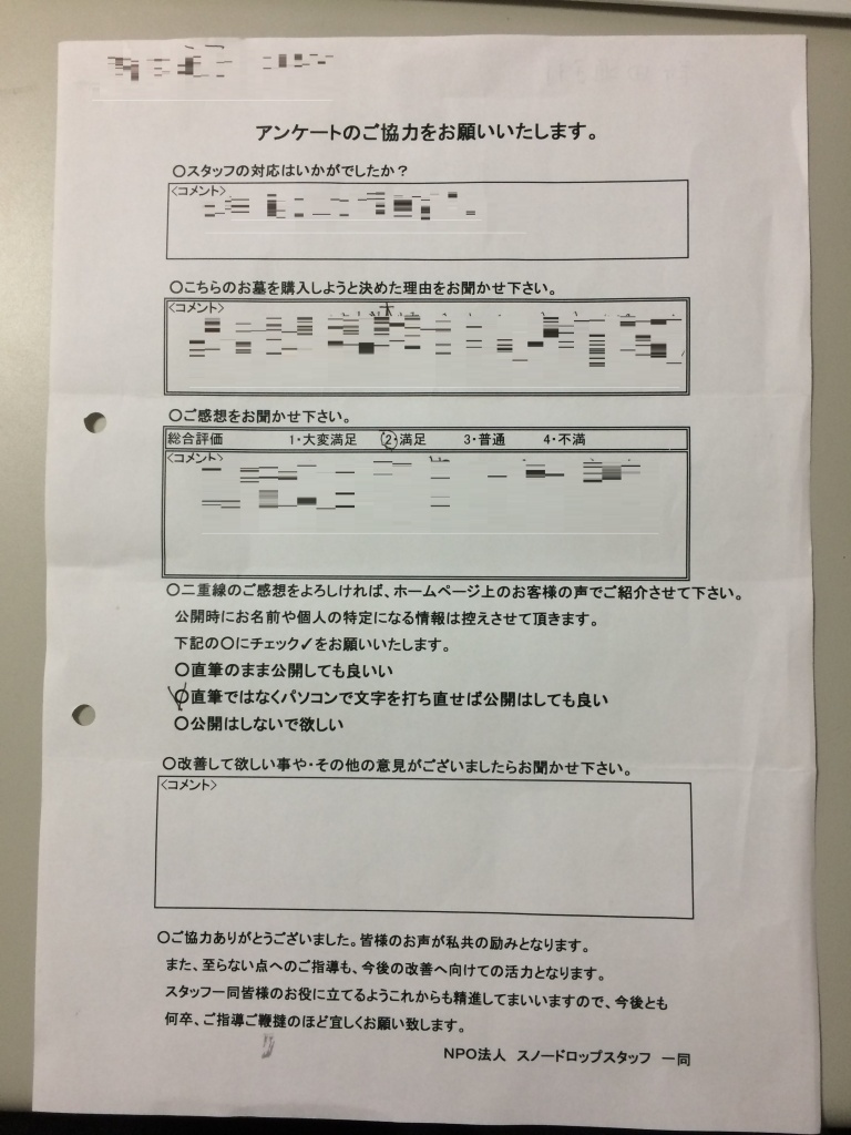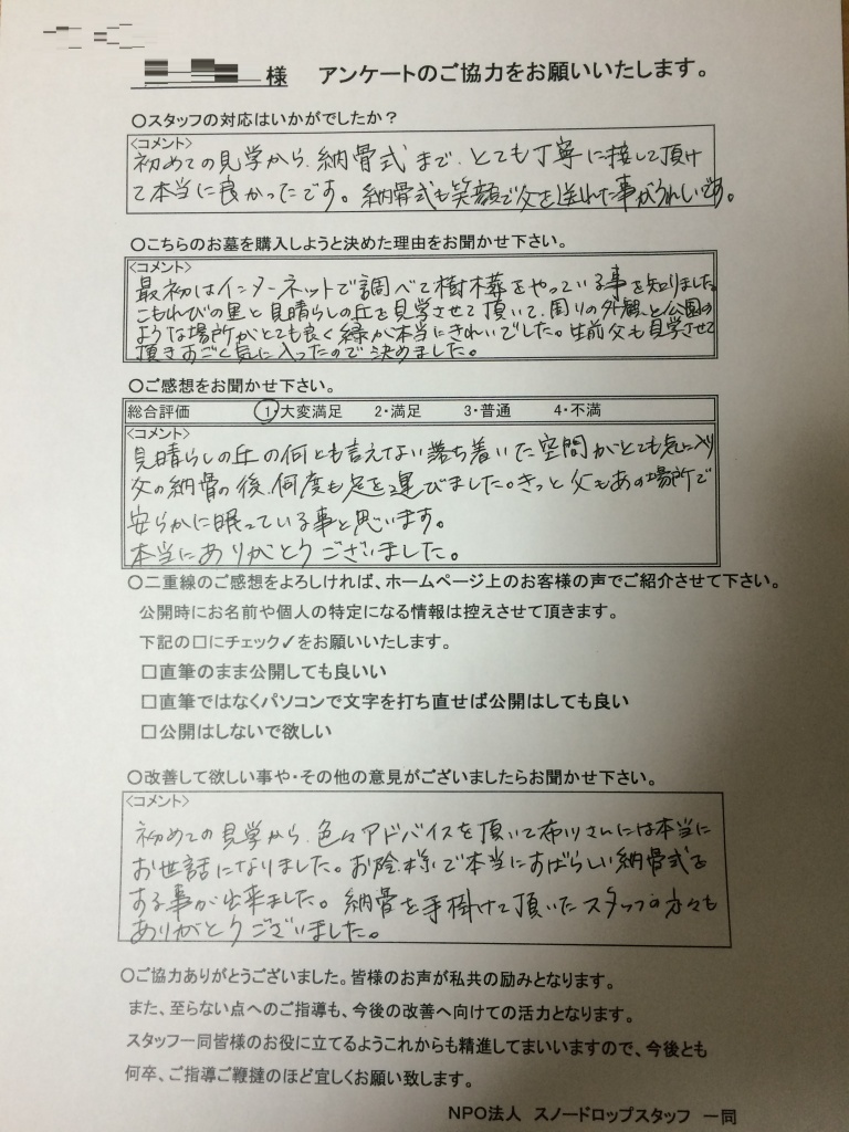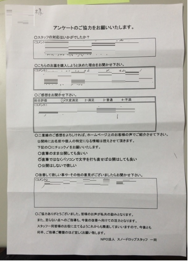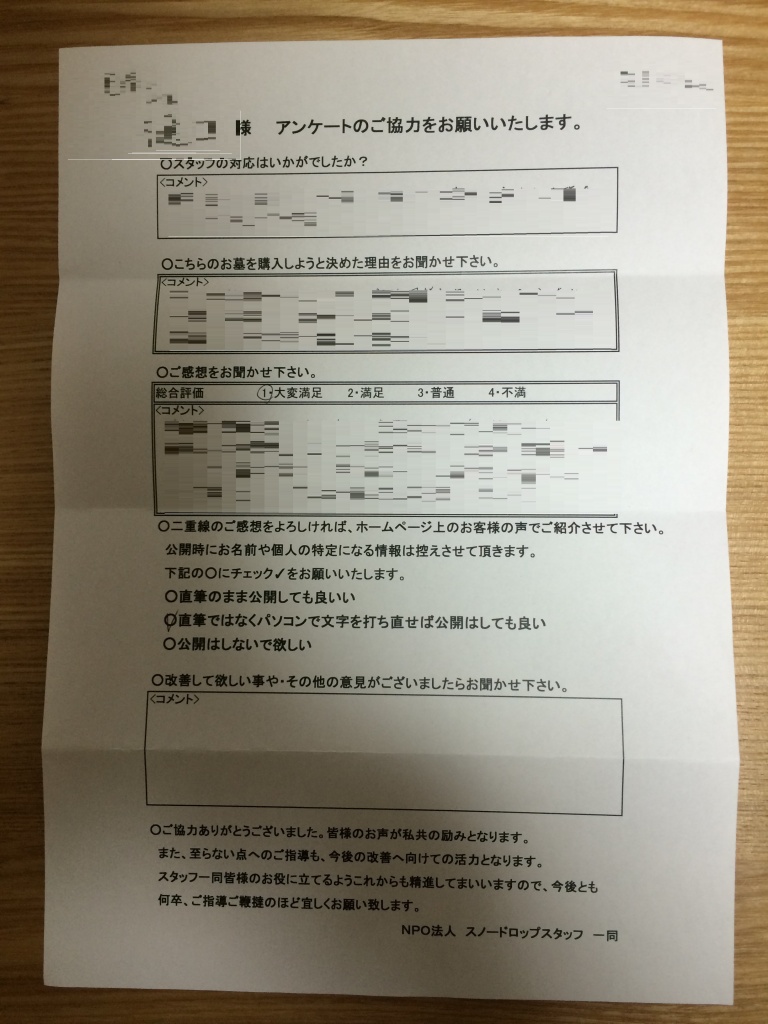 4月、お母様のご納骨をされました、M様よりアンケート頂きました。