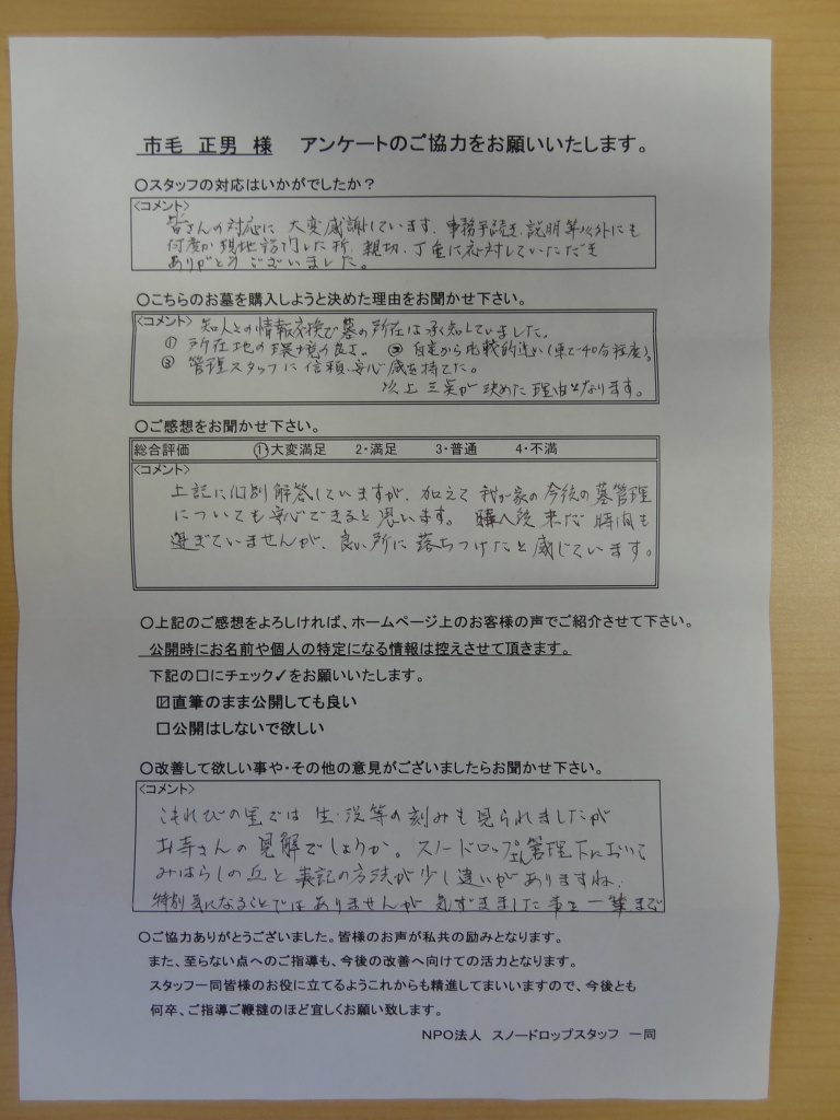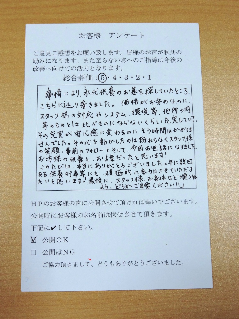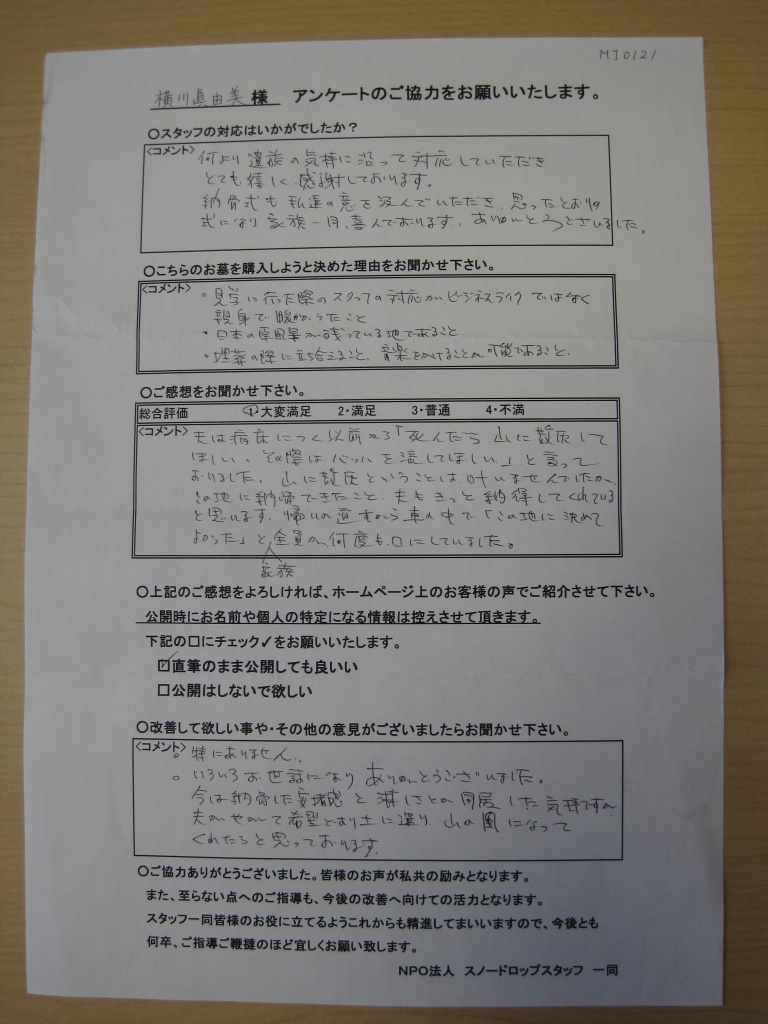 「見晴らしの丘」にご納骨されたY様よりアンケートを