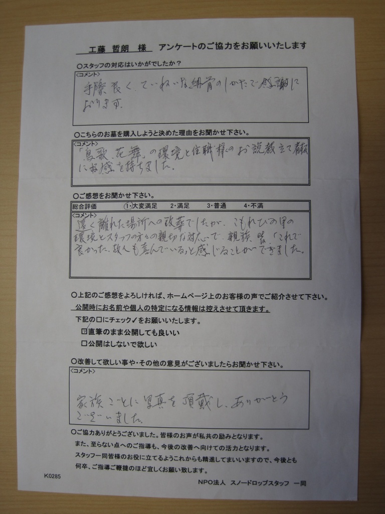 ご参列されたO様よりアンケートをご返送いただきました。
